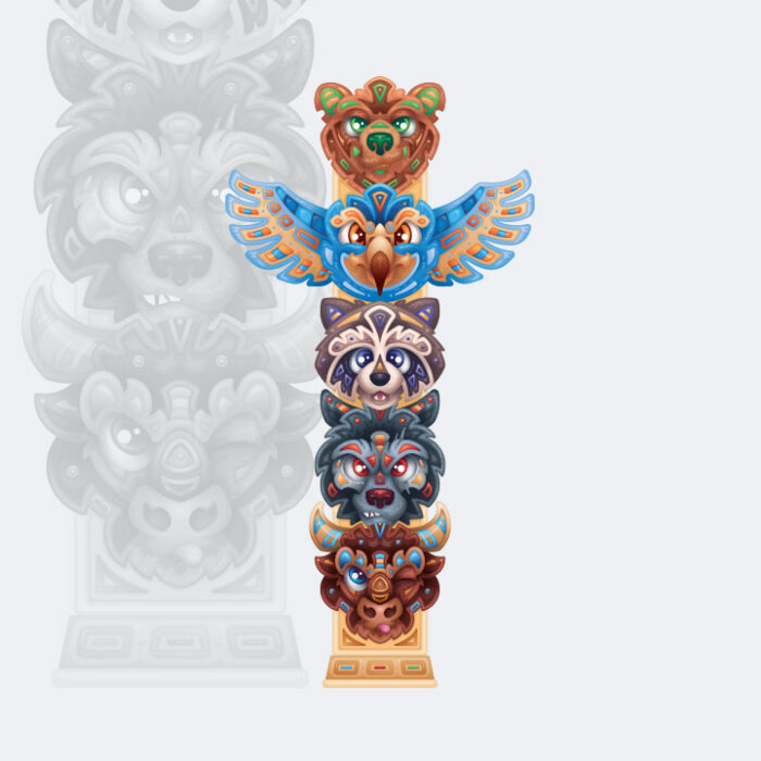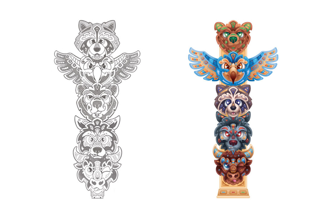 De volgende stap is het digitaliseren van de goedgekeurde schetsen. Alle dieren krijgen hun definitieve formaat, vorm- en vlakverdeling. Zowel individueel als in de gezamenlijke totempaal. Met zoveel dieren is het uiterst belangrijk om alle kleuren op elkaar af te stemmen. Een grondige kleurstudie is dan ook een van de belangrijkste stappen uit het gehele proces. Alles moet immers samenkomen en niet uiteenvallen (wat extra onhandig overkomt als je een totempaal ontwerpt). Eenmaal voorzien van persoonlijke kleuren die passen bij ieder karakter, komen alle schaduwen, verlopen en highlights er aan te pas om het gewenste 3D effect te realiseren.